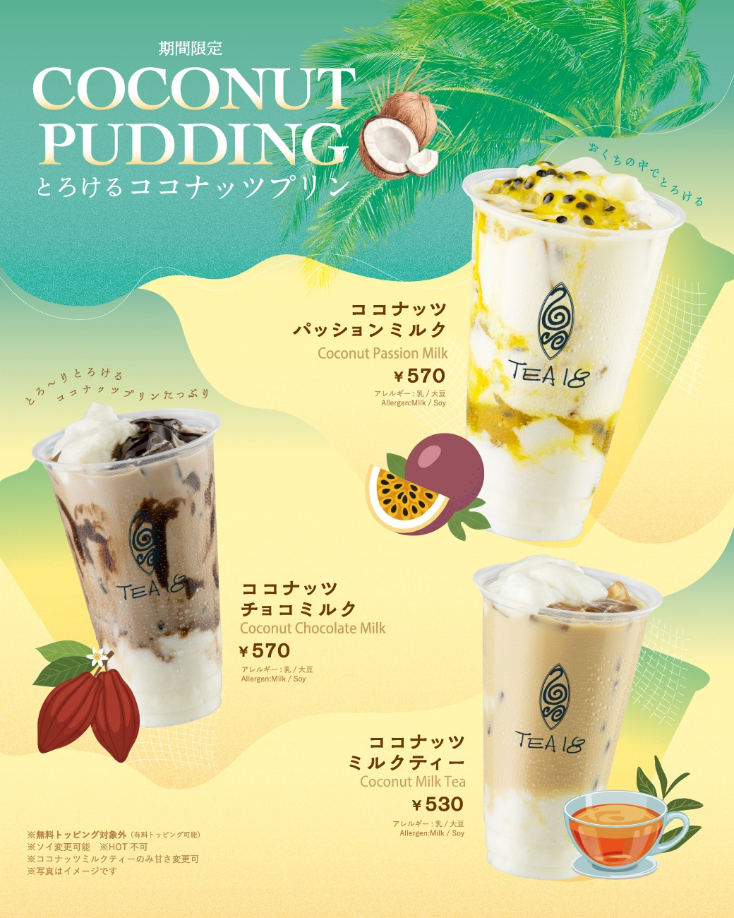 ※ココナッツプリンの商品はタピオカなどの「無料トッピング」対象外となります