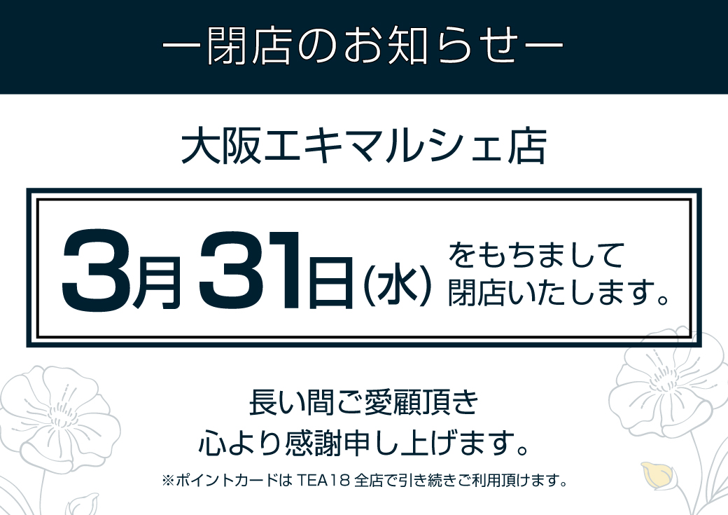 昨日3月31日を以てTEA18エキマルシェ大阪店は閉店させていただきました。