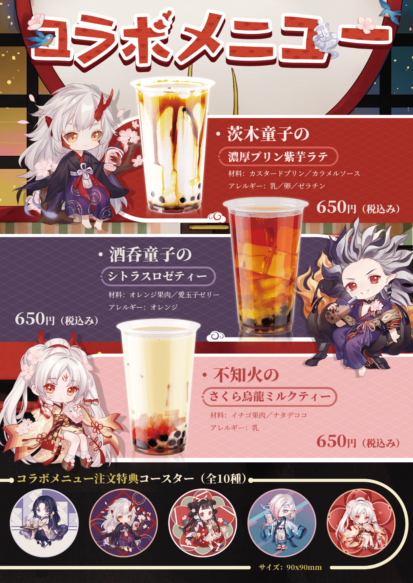 人気の3キャラクターをイメージしたオリジナルドリンクにノベルティは10種からランダムでGETできるコラボ限定コースター付き!