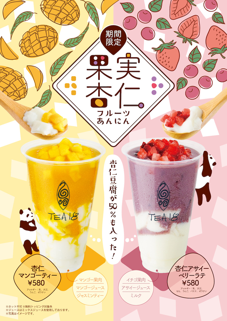 アルフォンソマンゴーをブレンドした濃厚ジュースにすっきりとしたジャスミン茶をあわせました。マンゴー果肉と杏仁豆腐の食感も楽しめるフルーティーな1杯です。